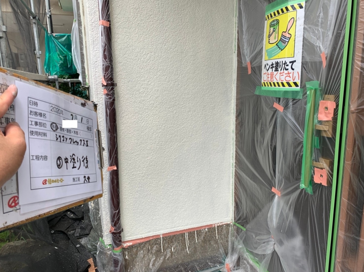 外壁 上塗り:中塗りと同じものを塗り、仕上げとして塗りムラや厚みをつけ、美観性と耐候性を高めます。下処理を十分にし、上塗りを規定内の希釈率で2回塗りすることにより、はじめてその塗料の持つ耐久性が確保できます。