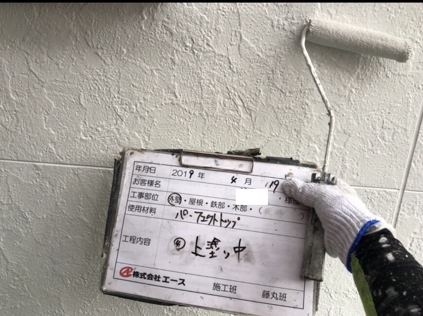 外壁 上塗り:中塗りと同じものを塗り、仕上げとして塗りムラや厚みをつけ、美観性と耐候性を高めます。下処理を十分にし、上塗りを規定内の希釈率で2回塗りすることにより、はじめてその塗料の持つ耐久性が確保できます。